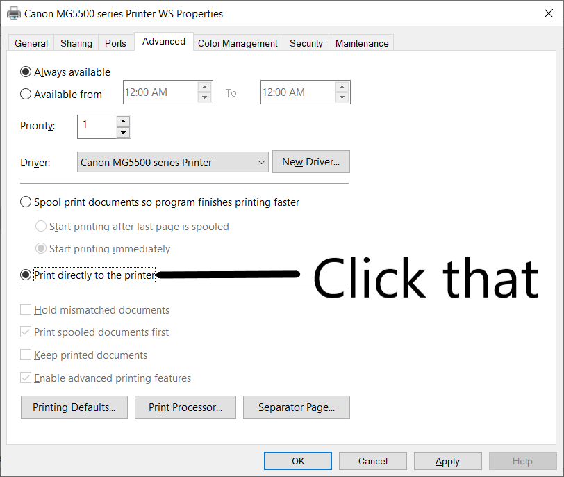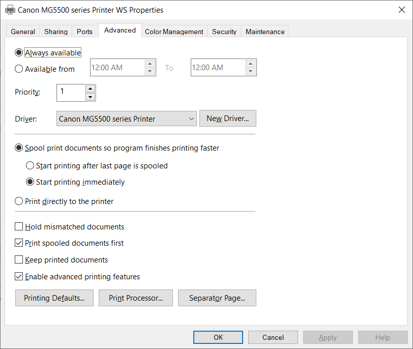 What should you do if you suspect issues with the spooler? Start in printer properties > Advanced tab.