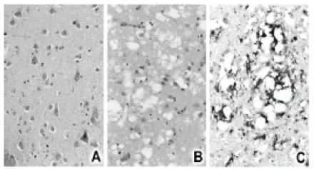 One conformation (PrPC) is greatly favored in normal, uninfected cells. Consequently, it is very rare for a pathogenic form to arise spontaneously (this may explain the late onset of sporadic CJD: it takes much time for the rare event to occur; however, an age-dependent somatic mutation cannot be ruled out)