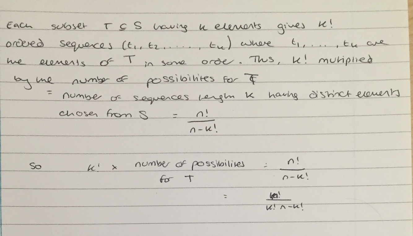 Lemma; Let S be a set having n elements and let 0<=k<=n. The number of subsets of S having exactly k elements is nCk = n!/(k! x (n-k!))