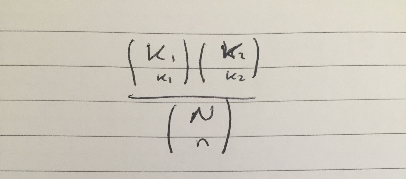 Suppose a population of size N=K1 + K2 contains K1 individuals of type 1 and K2 individuals of type 2. If sample of size n is drawn without replacement from this population it contains k1 individuals of type 1 and k2 individuals of type 2. Whats the probability