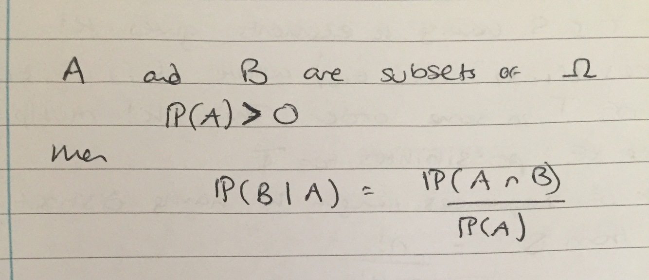 Give the conditional probability of P(B | A) and state the important conditions
