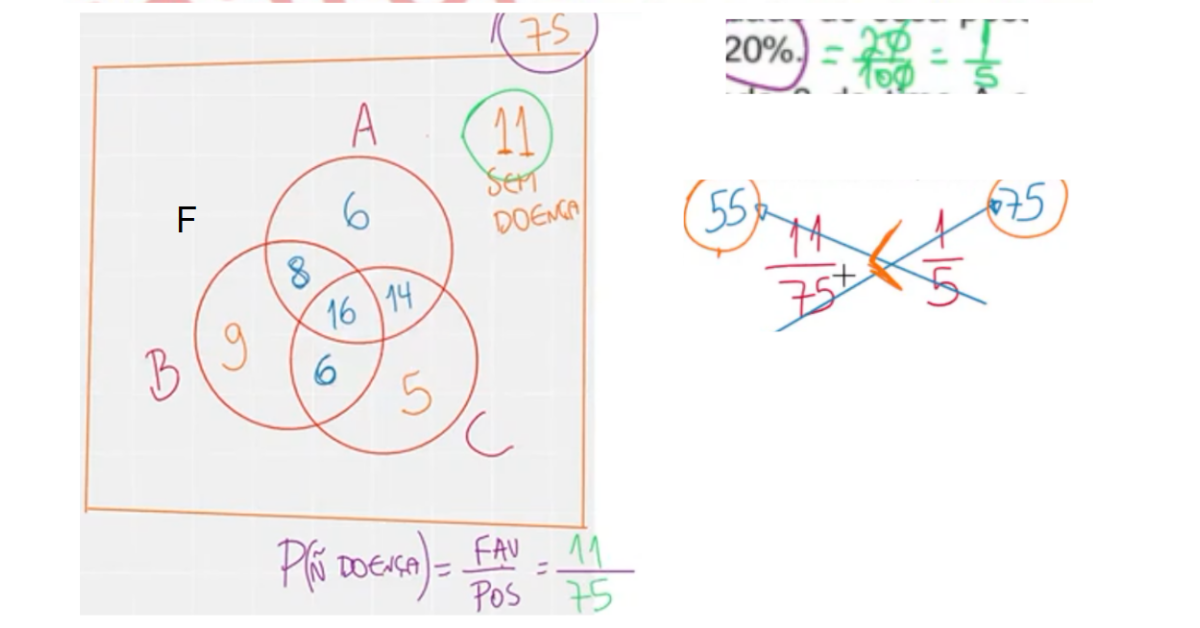 Um grupo de 75 pessoas foi entrevistado sobre doenças. Foi constatado entre os entrevistados que 16 pessoas já tiveram as doenças A, B e C; 30 já tiveram as doenças A e C; 24 já tiveram as doenças A e B; 22 já tiveram as doenças B e C; 6 tiveram apenas a doença A; 9 tiveram apenas a doença B; e 5 tiveram apenas a doença C. Se escolhermos ao acaso um dos entrevistados, a probabilidade de essa pessoa não ter sido acometida com nenhuma das três doenças é maior do que 20%.