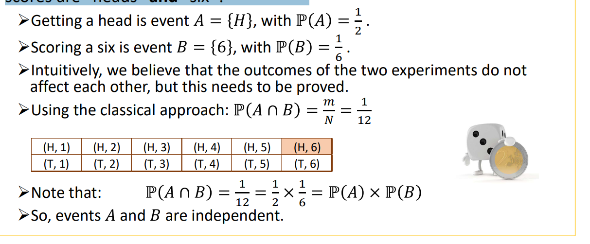 • Tossing a fair coin and rolling a fair die. What is the probability that the scores are “heads” and “six”?
