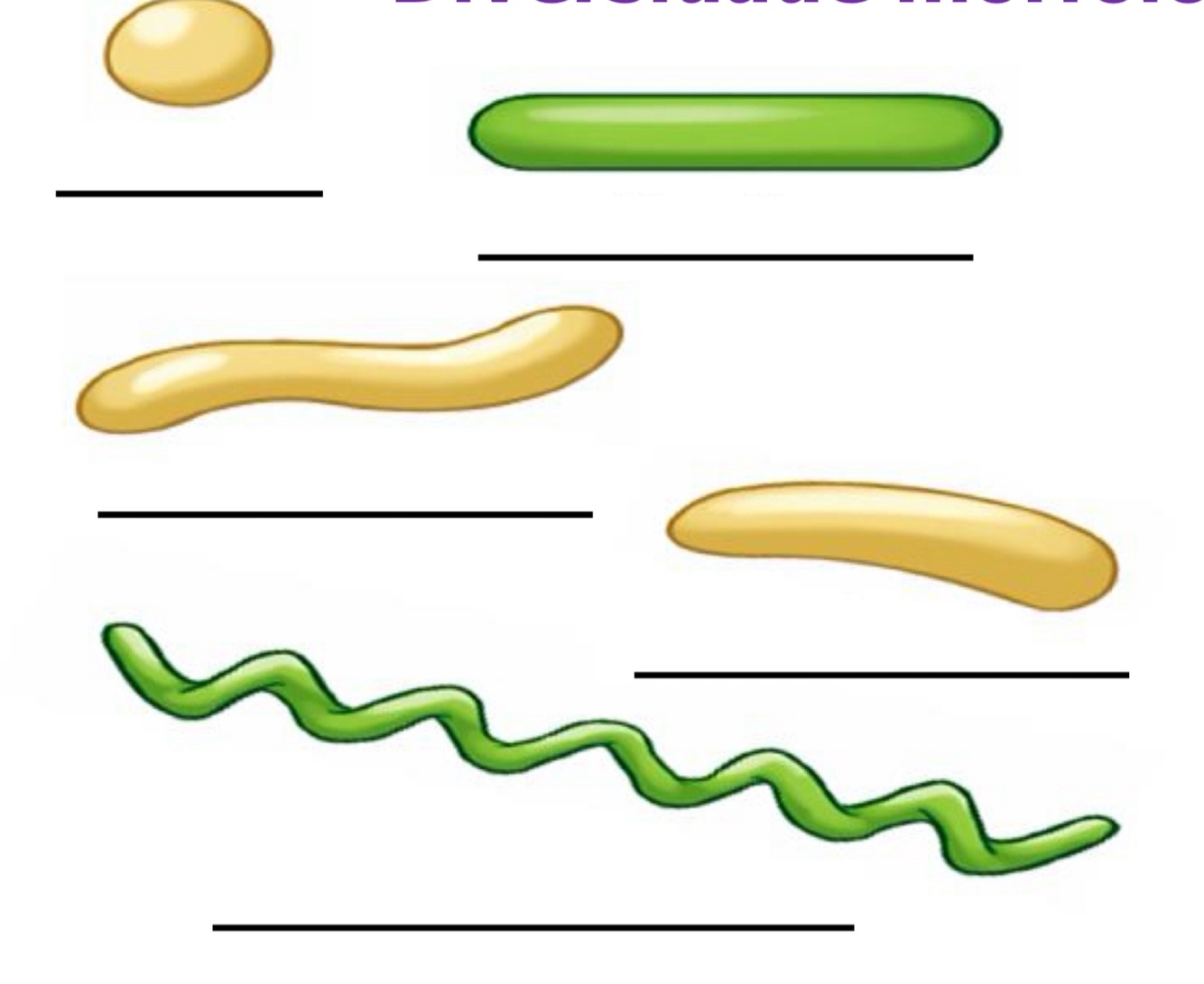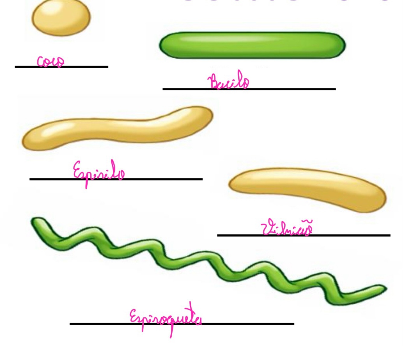 Complete as lacunas com os nomes das morfologias das bactérias da imagem abaixo.