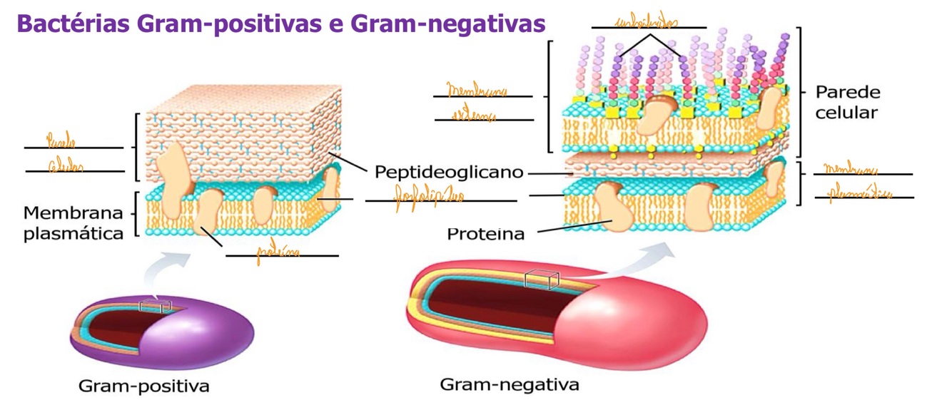 Uma bactéria gram-positiva além de membrana plasmática apresenta uma parede celular espessa, já uma bactéria gram-negativa apresenta, além de membrana plasmática, uma parede celular fina e uma membrana externa espessa.