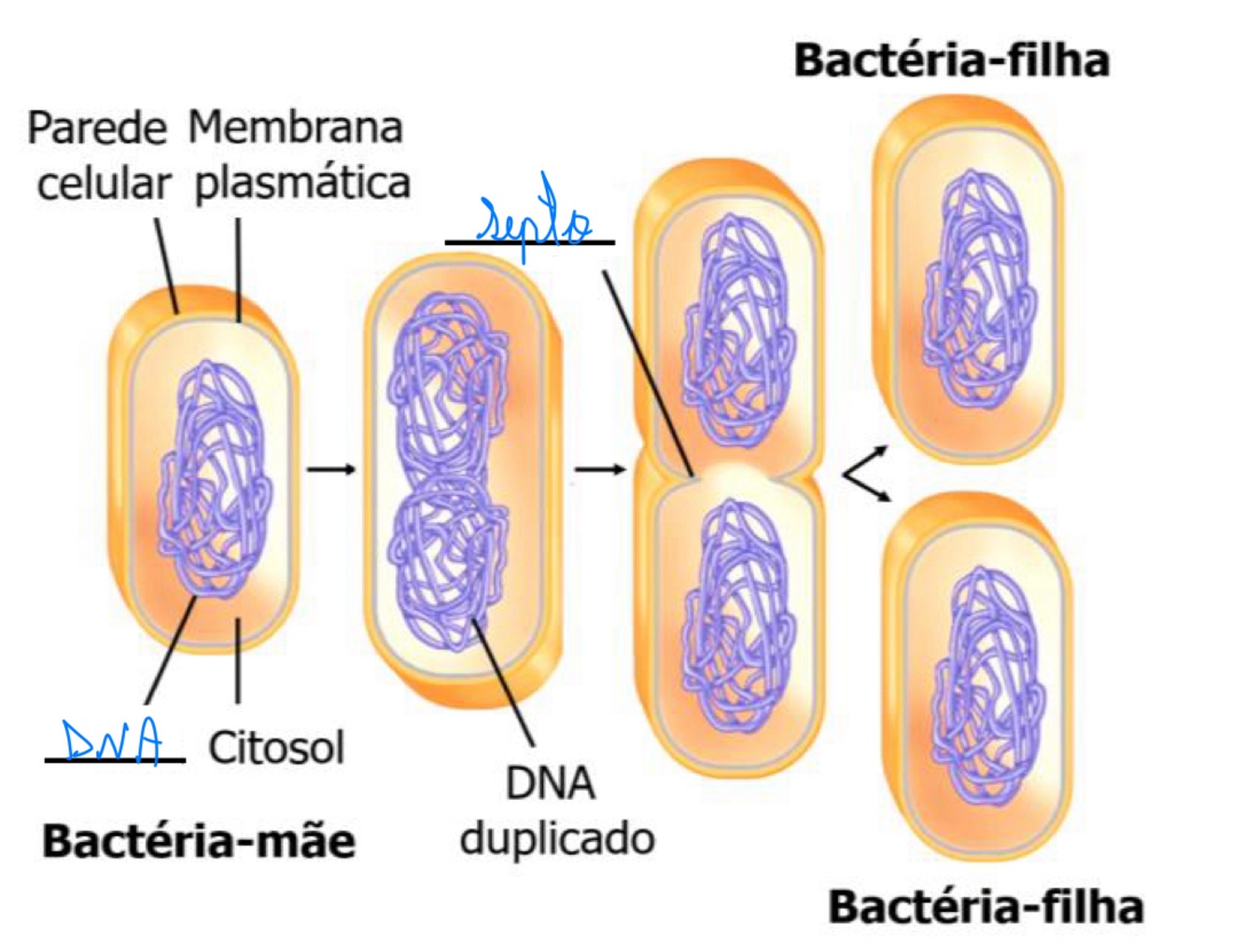 Uma bactéria mãe origina duas bactérias filhas idênticas.