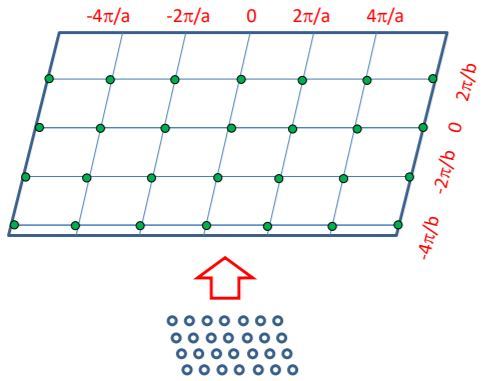 It generates a 2D spot pattern of a 2D surface with the spots representing the atoms. Pattern spacing still decreases with increasing interatomic seperation, either a or b.