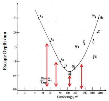 Electrons with around 100 eV of kinetic energy with an escape depth of around 0.7 nm before they collide and lose energy = low energy electrons. If we observe these electrons then we know they’re from the surface layers.