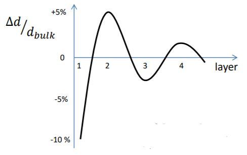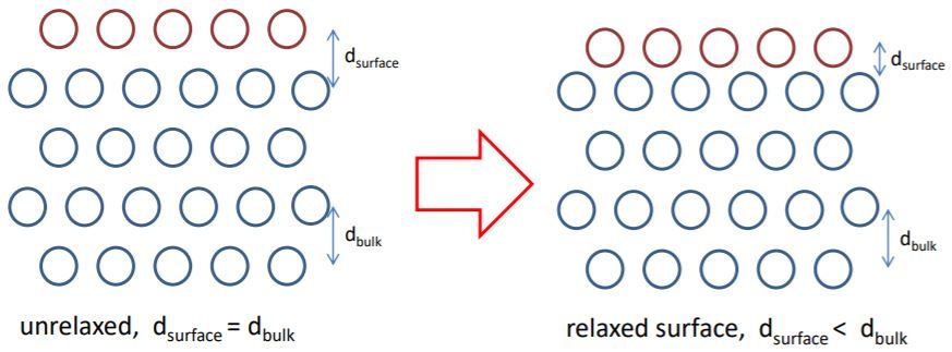 There is a maximum relaxation of around 10% for the first surface layer for ‘open’ surfaces e.g. FCC (110). The relaxation effect also affects deeper layers, but the effect is decreased for each subsequent layer.