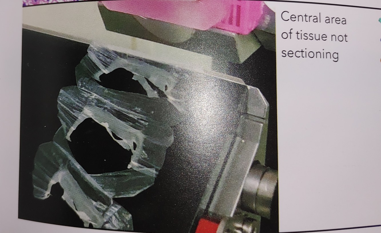 If you encounter a block where the central tissue is not sectioning, what are the casue(s) and corrective action(s)?