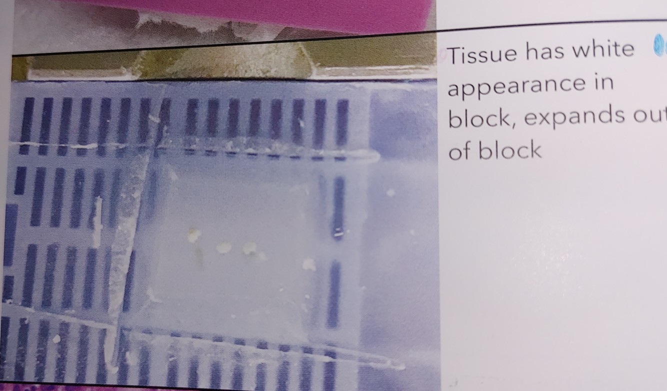 If you encounter a block where the tissue apears white and expands/bludges out, what are the casue(s) and corrective action(s)?
