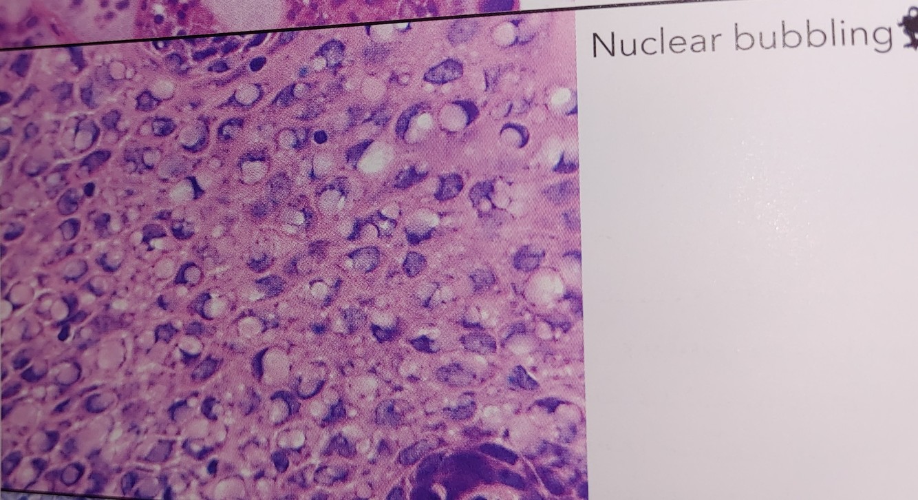 Compare to washed out epithelial nuclei & nuclear bubbling