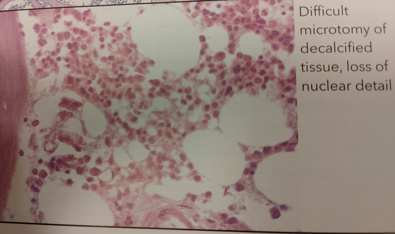 If you encounter difficult microtomy of decalcified tissue and/or loss of nuclear detail, what are the casue(s) and corrective action(s)?