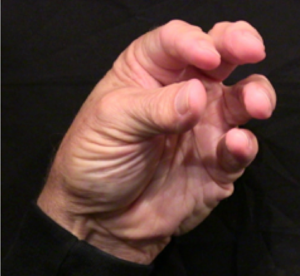 Position: Tuck the ring and little finger tips to the palm, flex index and middle finger to touch the tip of the thumb as if holding a golf ball.
