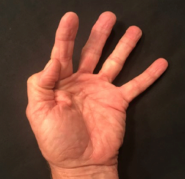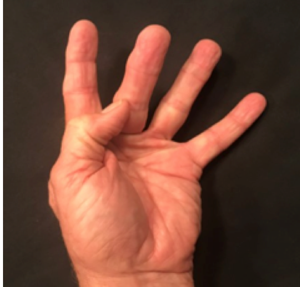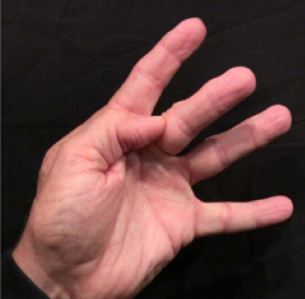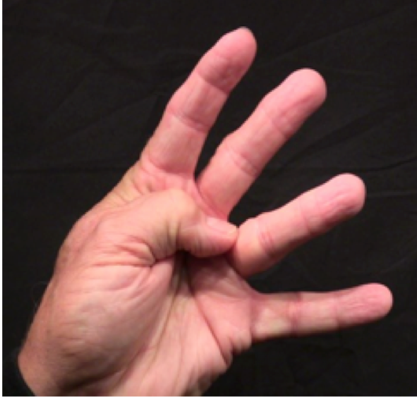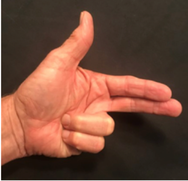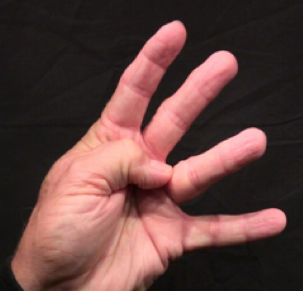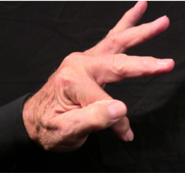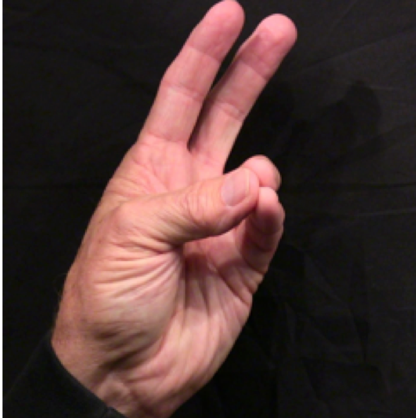 Position: Full extension of the thumb, index and middle fingers, with flexion of the ring and little fingers so the finger tips contact the palm of the hand.