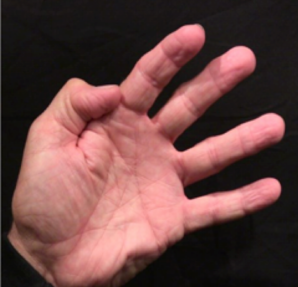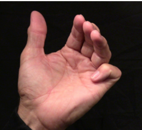 Position: Thumb tip to the little finger tip. A specific angle of thumb and finger is required of 90 degrees.