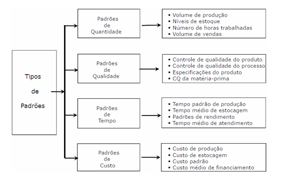 Dentre os tipos de padrões, os principais são: padrões de quantidade, de qualidade, de tempo e de custo.