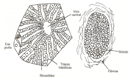 Perda da dinâmica do órgão, formação de nódulos rodeados por fibrose -> a distribuição desses nódulos pelo parênquima é que gera a cirrose = hipertensão portal