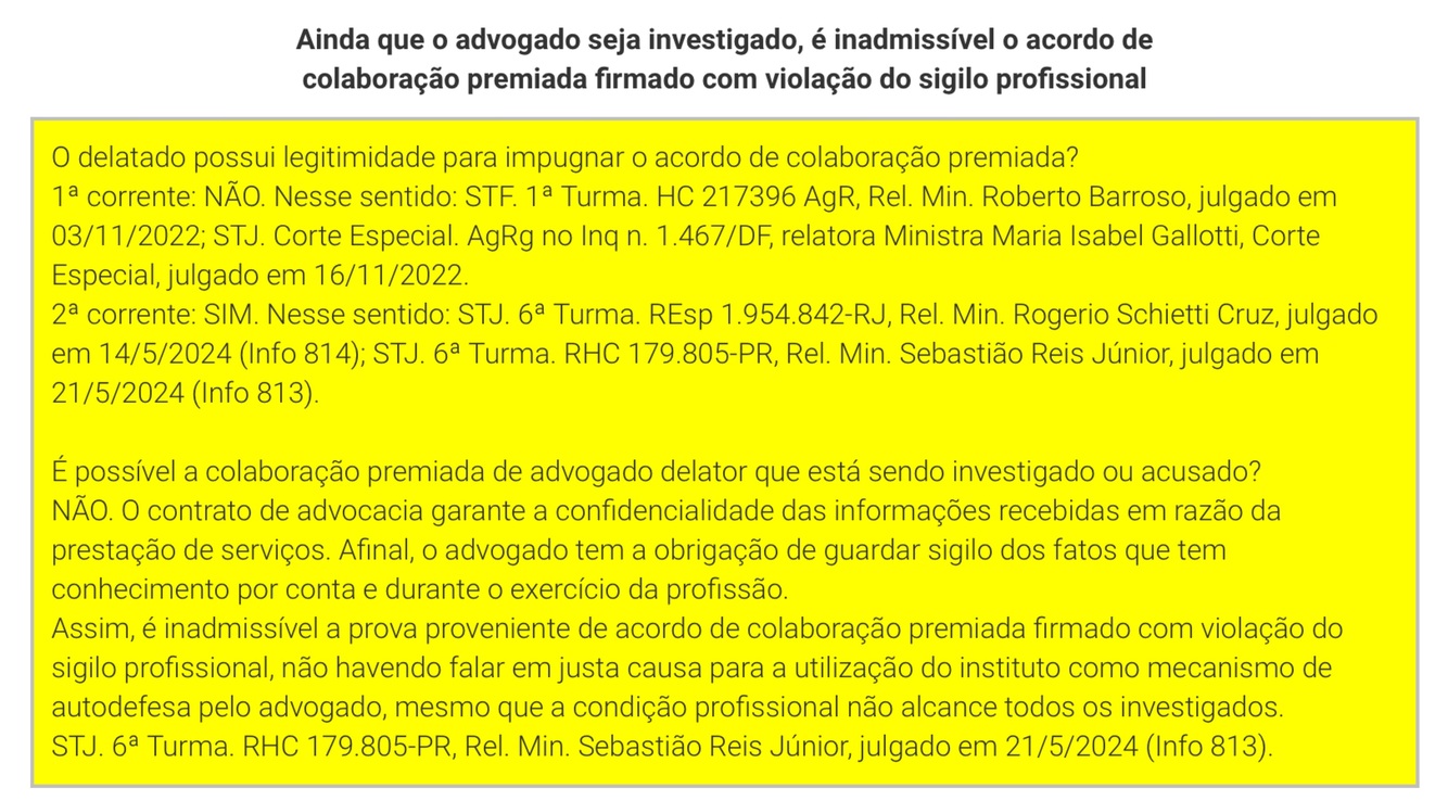 Assim, é inadmissível a prova proveniente de acordo de colaboração premiada firmado com violação do sigilo profissional, não havendo falar em justa causa para a utilização do instituto como mecanismo de autodefesa pelo advogado, ➡️ mesmo que a condição profissional não alcance todos os investigados.