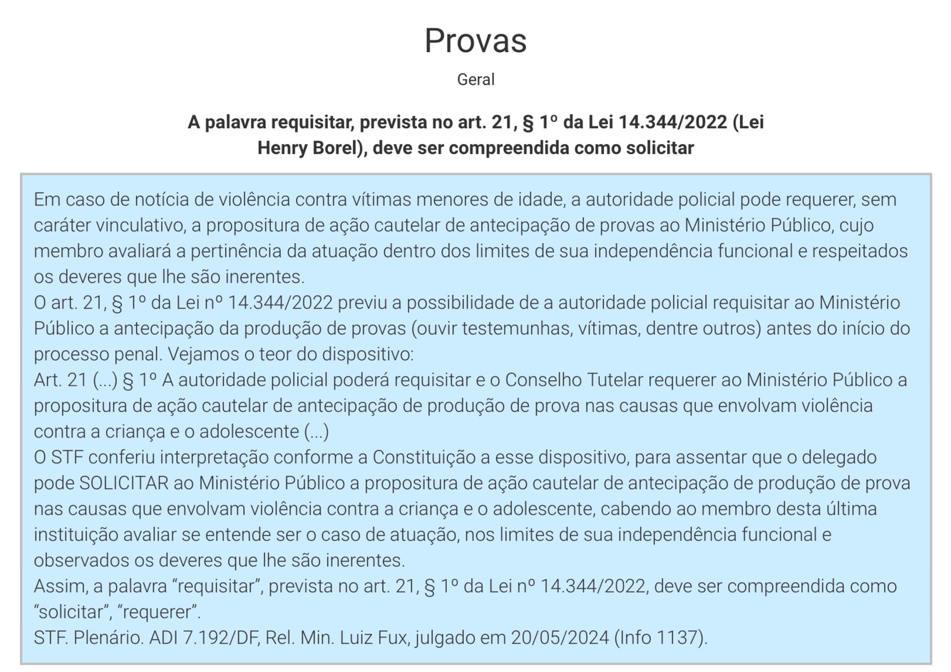 Segundo a Lei Henry Borel, a autoridade policial poderá requisitar ao Ministério Público a propositura de ação cautelar de antecipação de produção de prova nas causas que envolvam violência contra a criança e o adolescente? O que entende o STF sobre o tema?