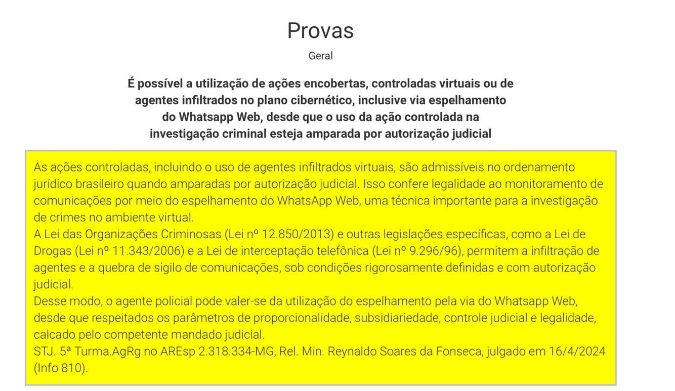 É possível a utilização, no ordenamento jurídico pátrio, de ações encobertas, controladas virtuais ou de agentes infiltrados no plano cibernético, inclusive via espelhamento do Whatsapp Web, desde que o uso da ação controlada na investigação criminal esteja amparada por autorização judicial.