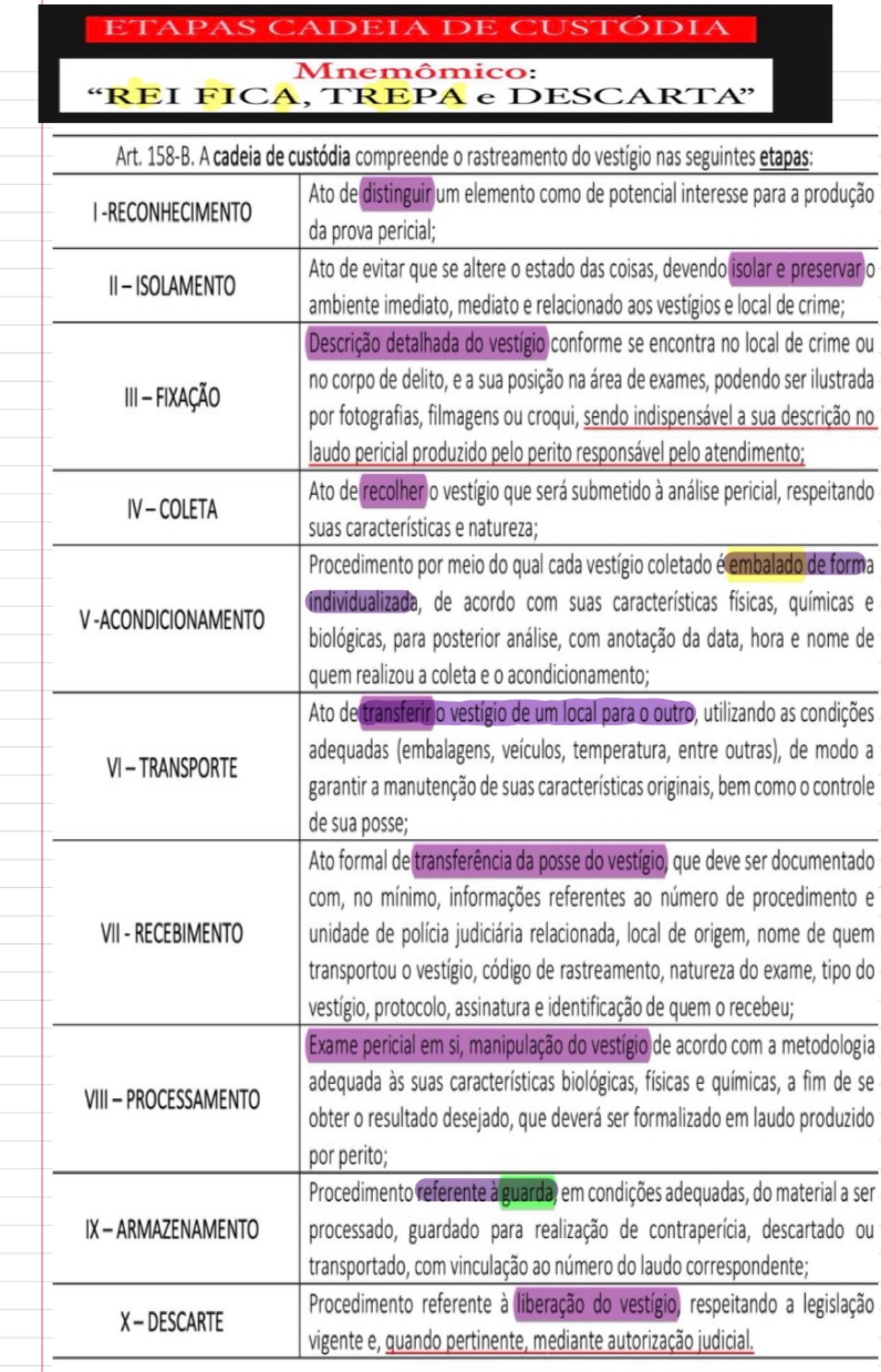 Cite e conceitue as etapas da cadeia de custódia: