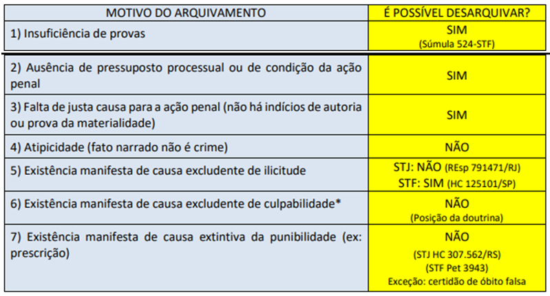 Súmula Vinculante nº 14: É direito do defensor, no interesse do representado, ter acesso amplo aos elementos de prova que, já documentados em procedimento investigatório realizado por órgão com competência de polícia judiciária, digam respeito ao exercício do direito de defesa. “Arquivado o Inquérito Policial, por despacho do Juiz, a requerimento do Promotor de Justiça, não pode a ação penal ser iniciada, sem novas provas.