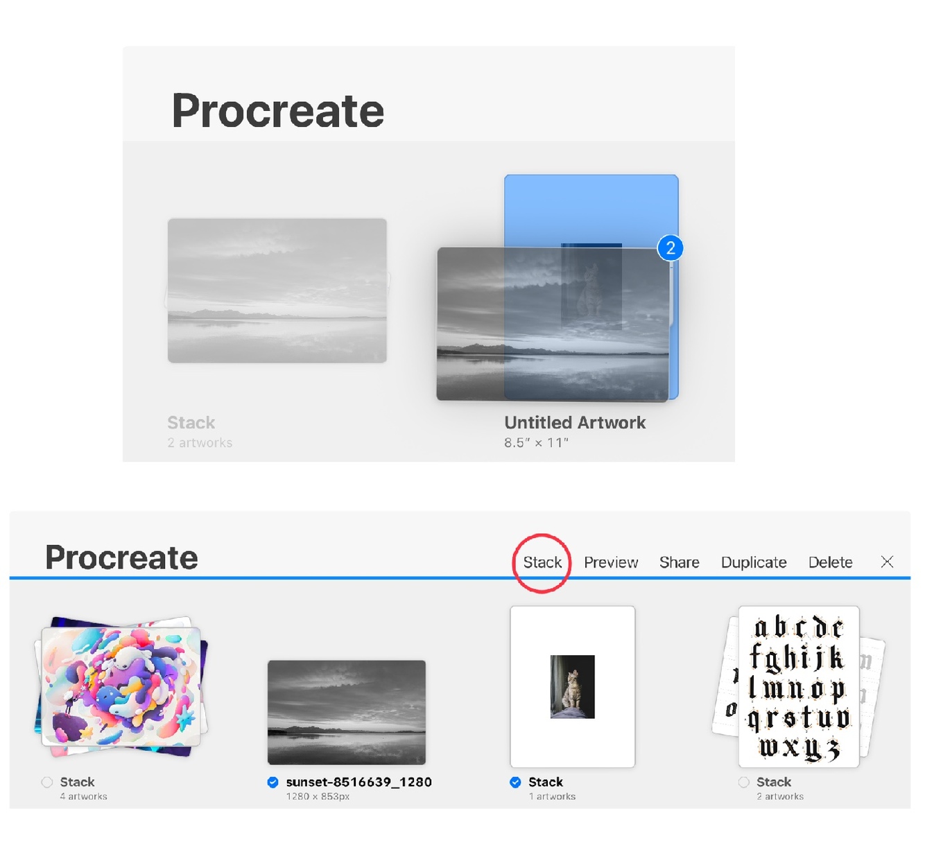 From inside a Stack, tap and hold a canvas, then drag a canvas to the Stack name in the top left-hand corner of the screen – wait until the black Stack name changes to blue and the word Procreate appears. Keep holding the canvas until you drag it where you want it to be.