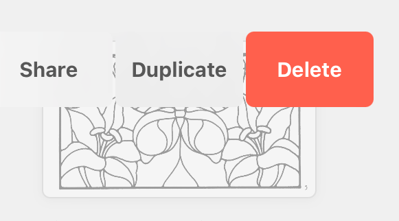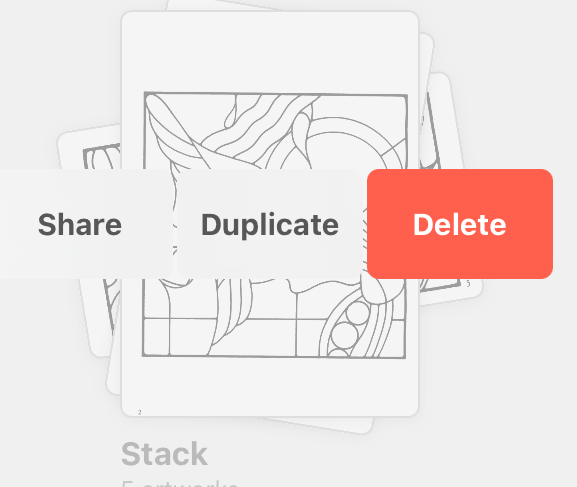 Right to left swipe on a canvas thumbnail in the Gallery or an opened Stack. Select Share, Duplicate or Delete from the menu.