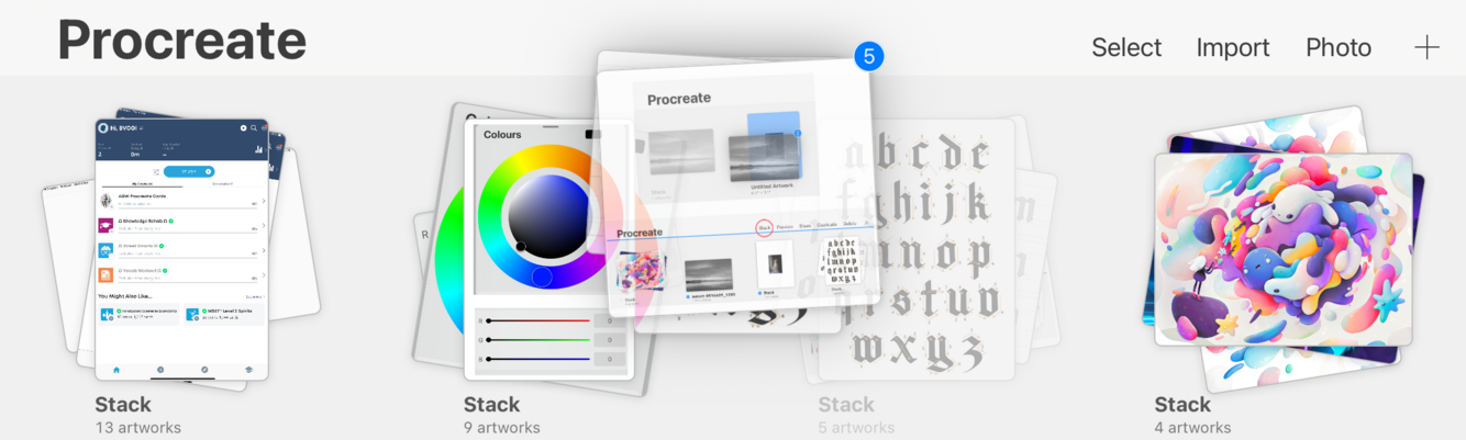 The Gallery is the Procreate home screen. You are automatically in the Gallery when you open Procreate. From the Gallery, you can see your canvasses and Stacks. The word “Procreate” appears at the top left-hand corner of the screen.