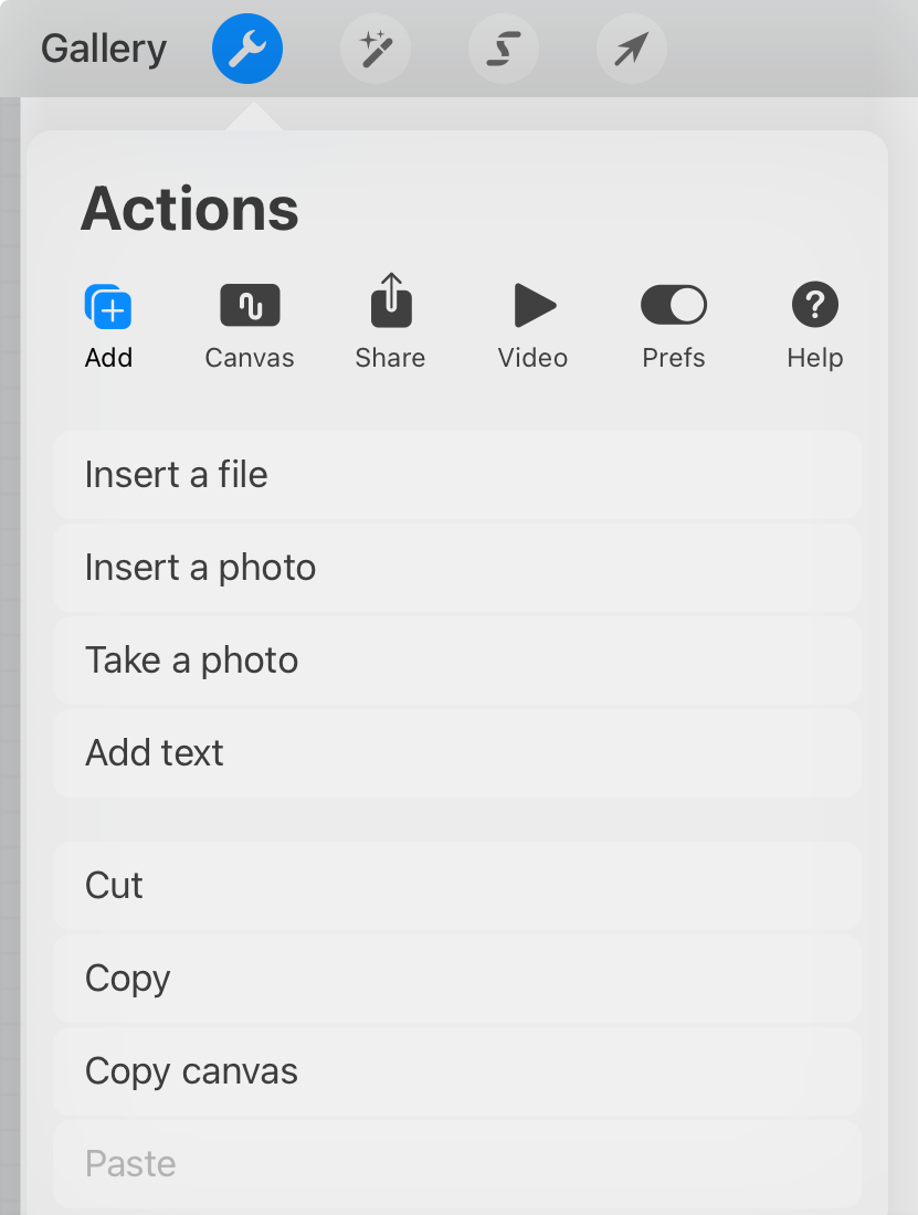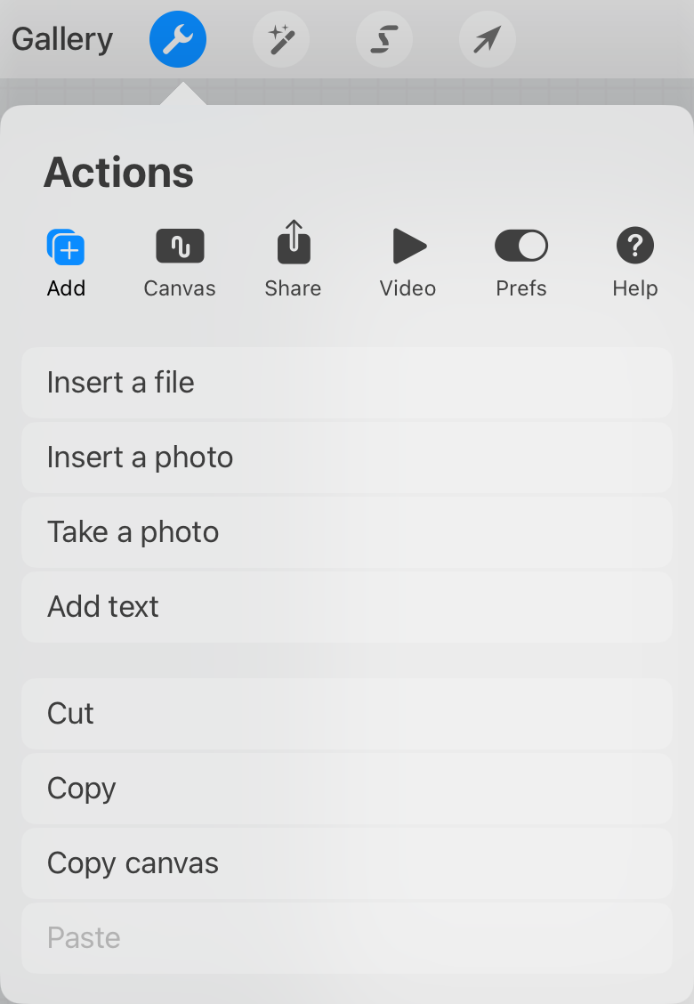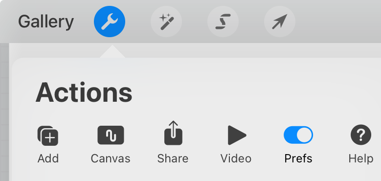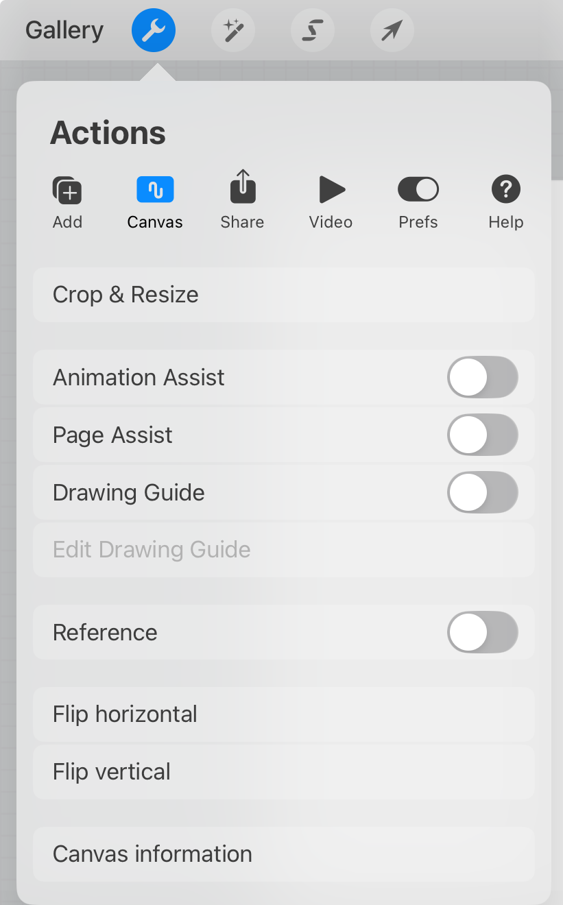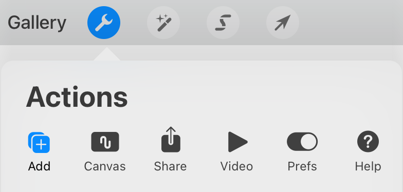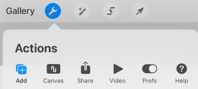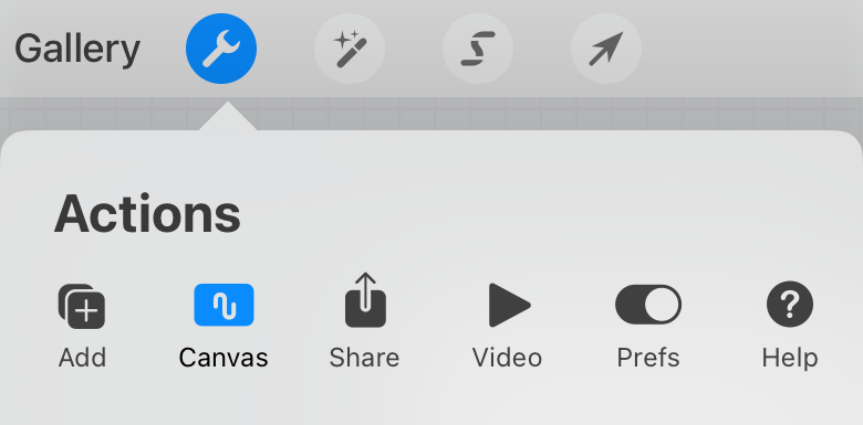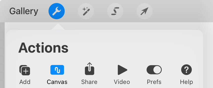 What tools are in the “Canvas” menu under Actions (Wrench icon)?
