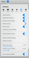 Where is the menu item to move the interface that controls brush size and brush opacity from the left-hand side of the screen to the right-hand side?