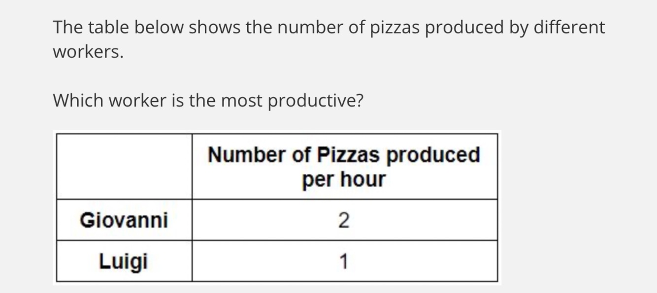 Giovanni is the most productive as he is able to produce the most pizzas per hour