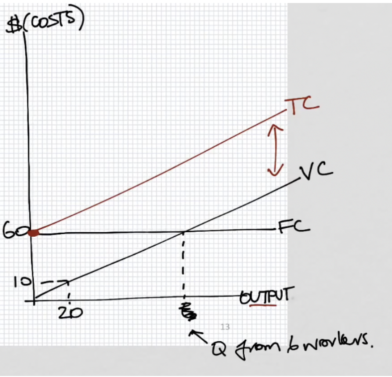 The total cost will run parallel to the variable cost, with the difference between the two lines being the fixed cost