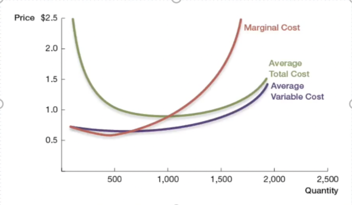 This occurs until higher levels, when the increase in average variable cost becomes greater and a larger component of ATC, bringing average costs up