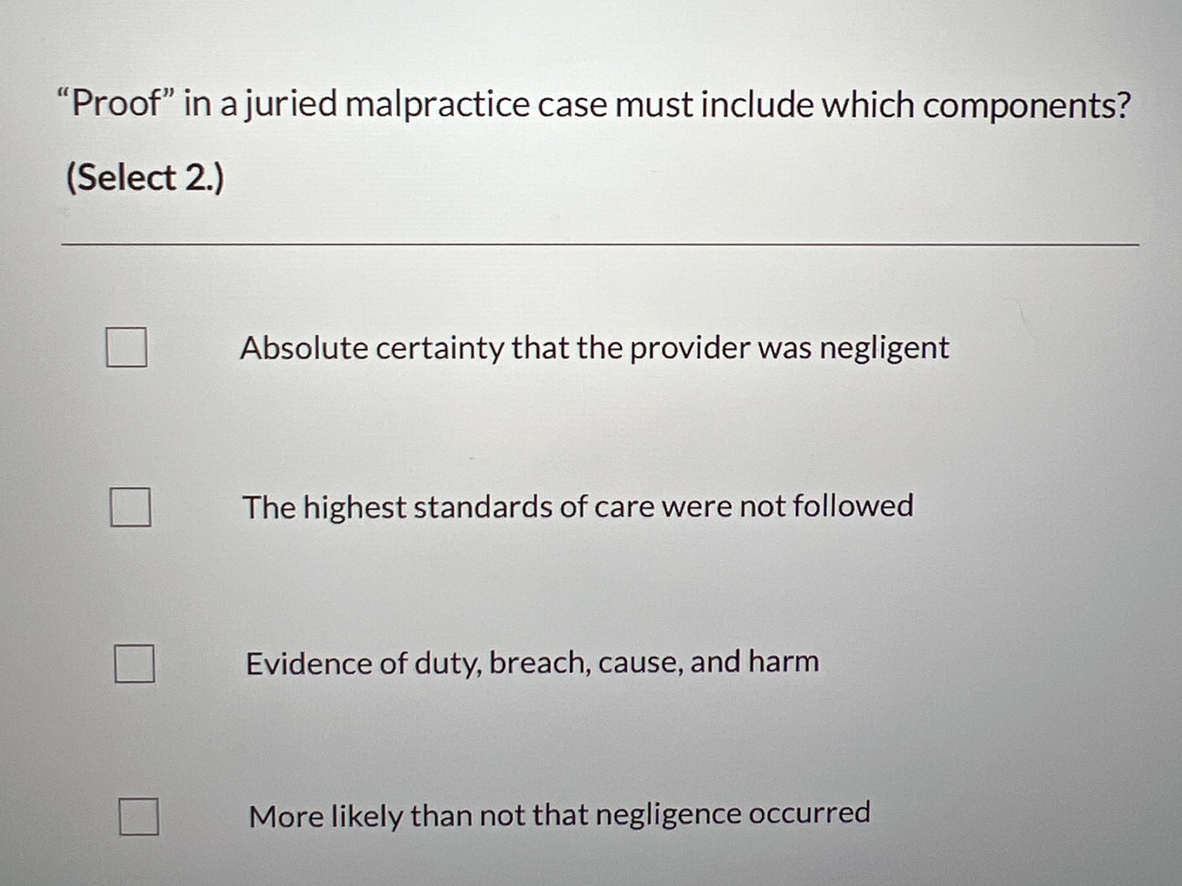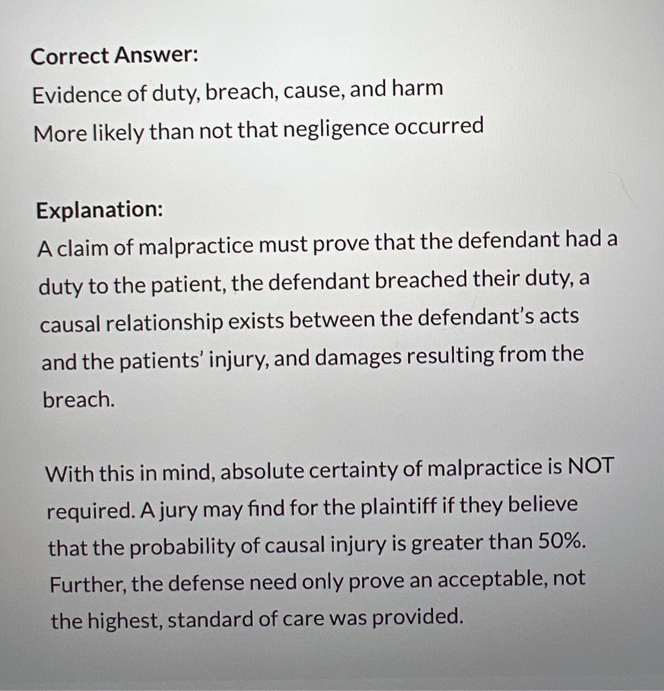 What 4 things must be proven in malpractice?