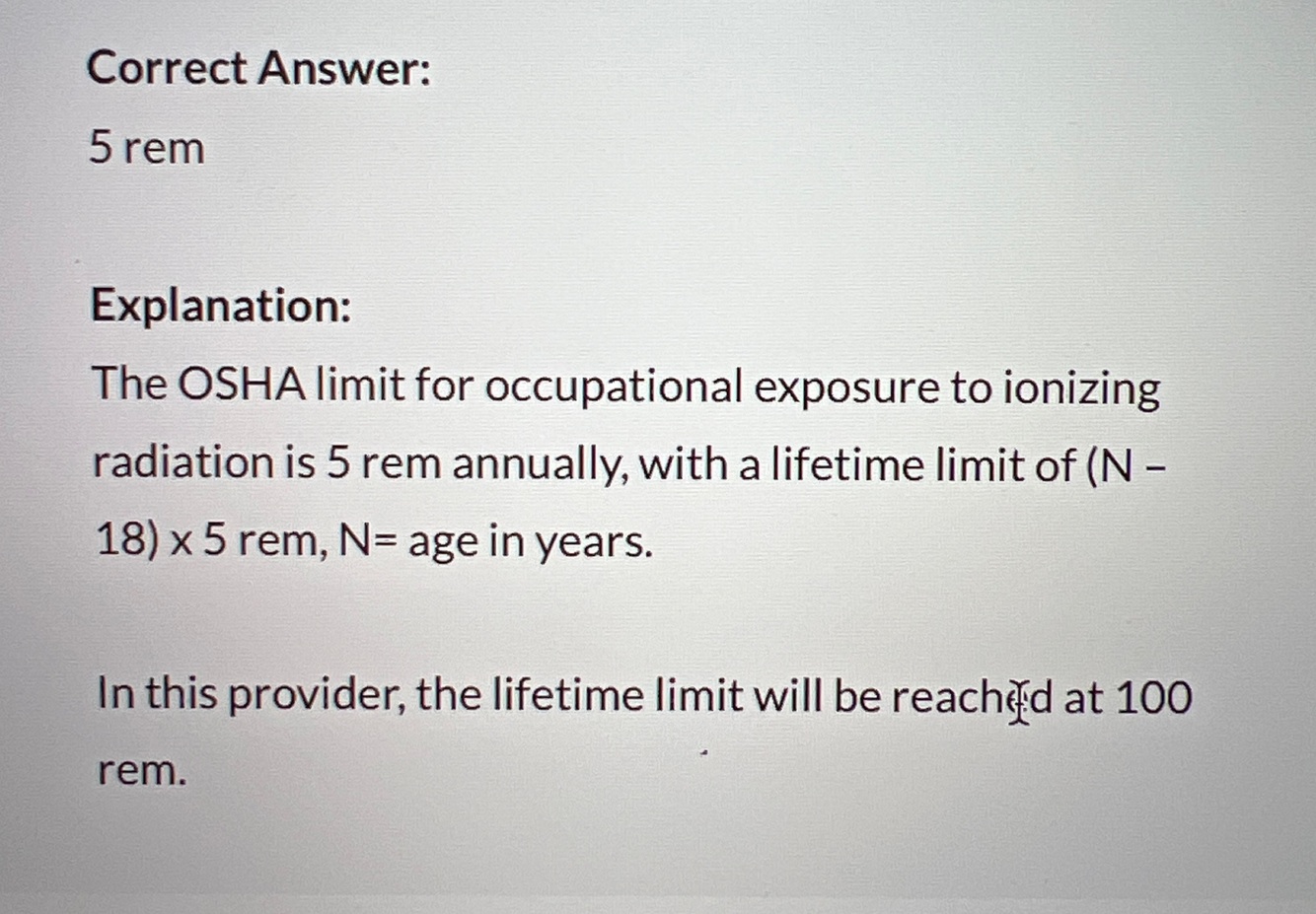 What is the annual OSHA limit for workplace exposure to ionizing radiation in a 38-yr old provider?