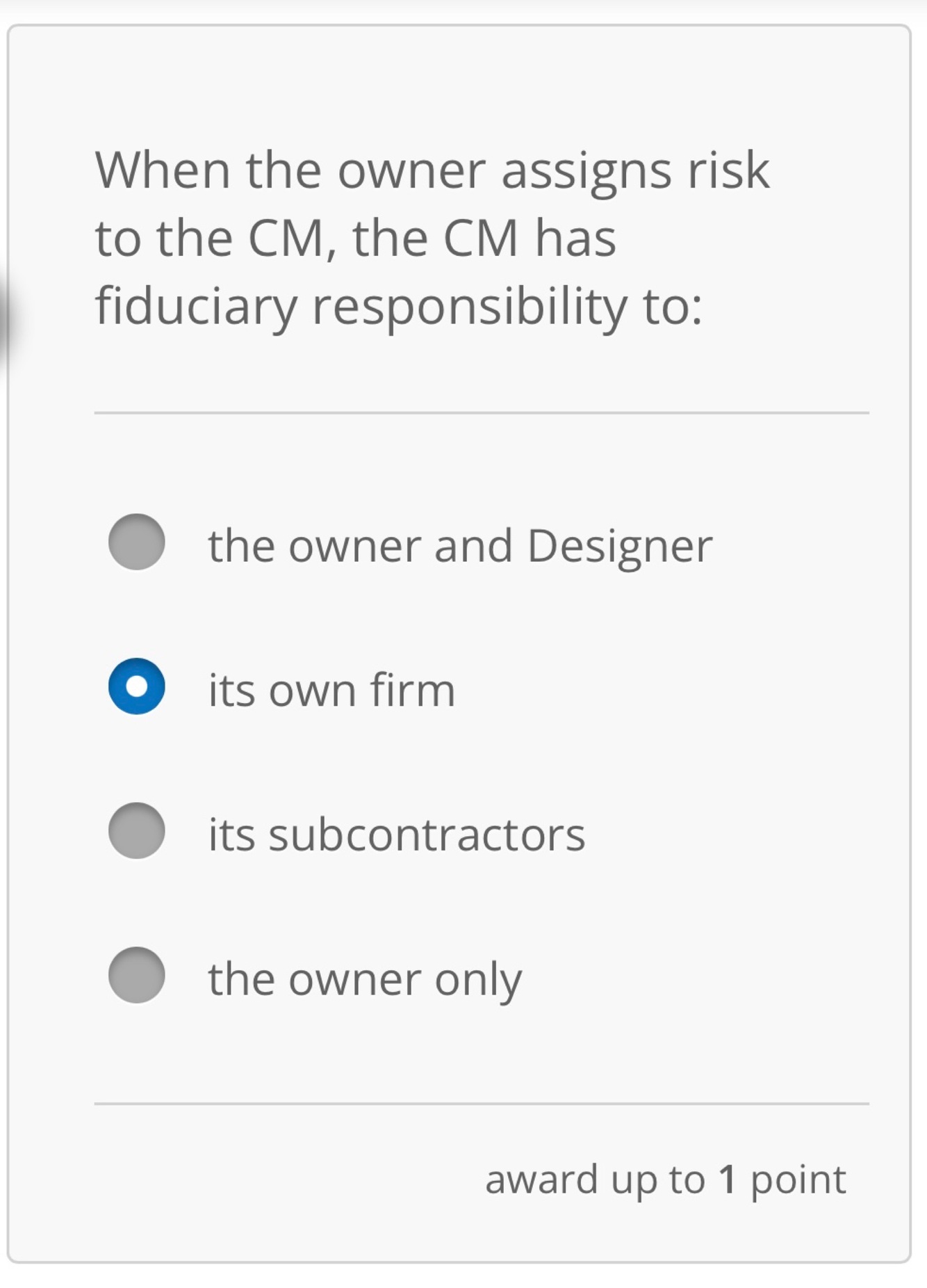 When the owner assigns risk to the CM, the CM has fiduciary responsibility to: