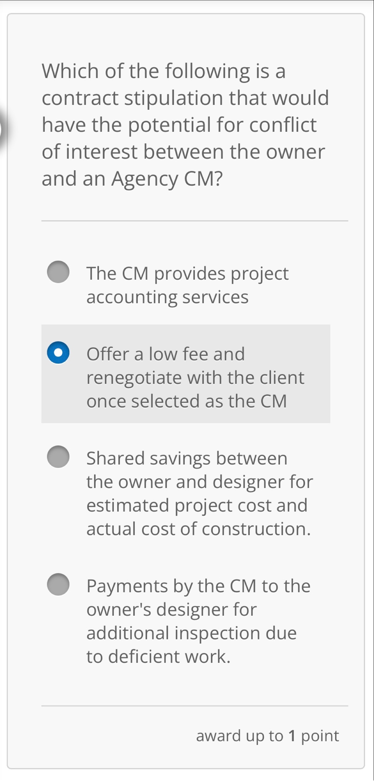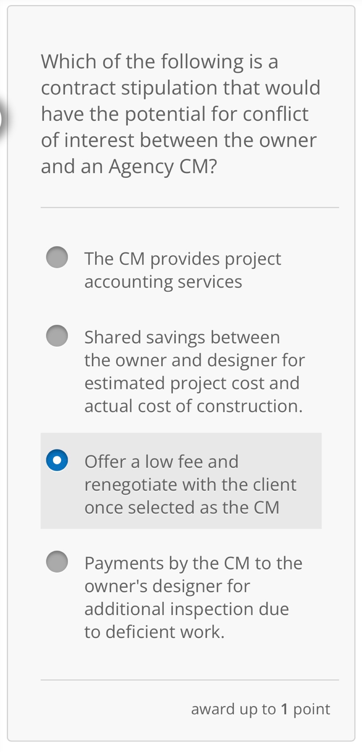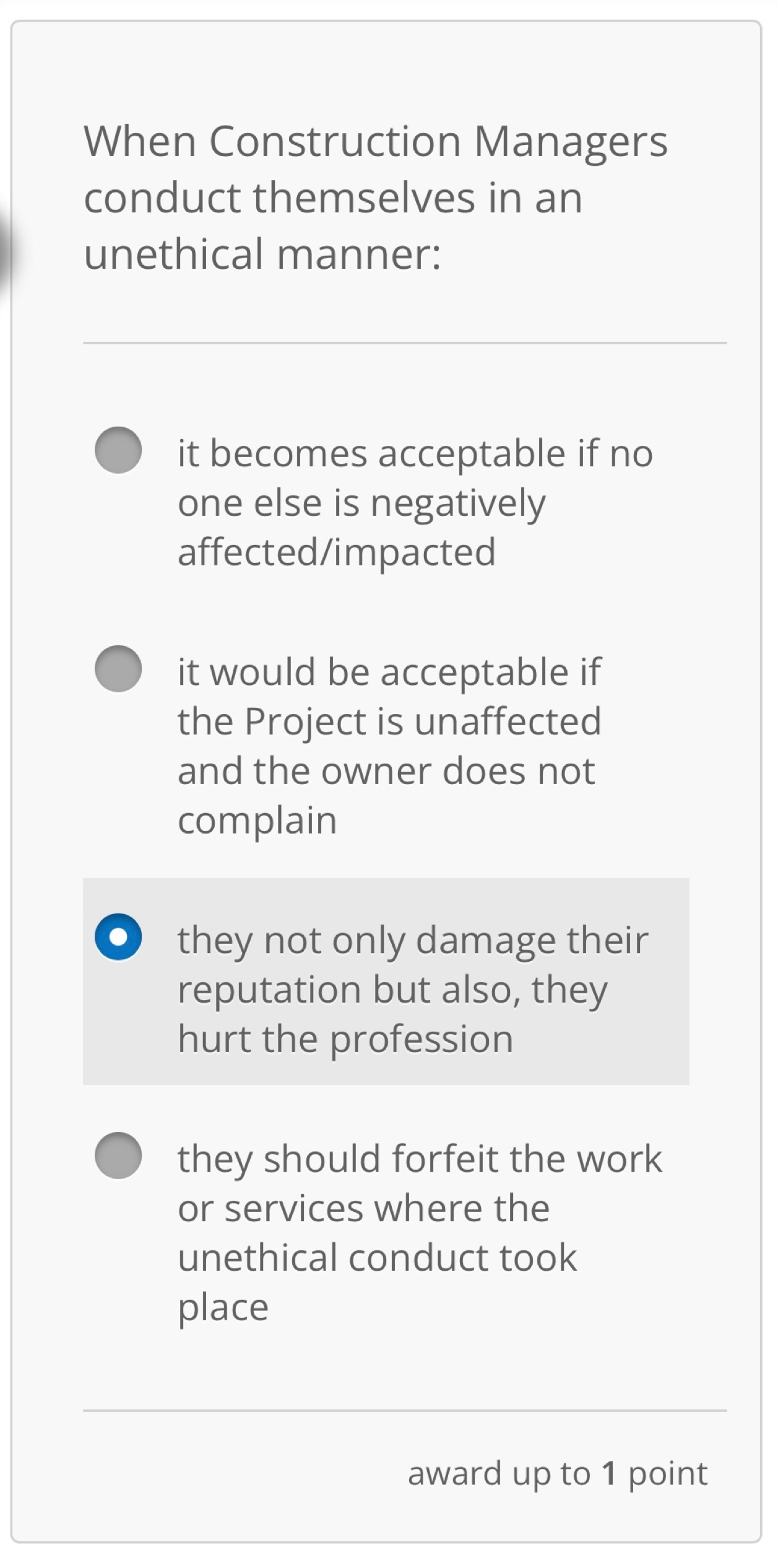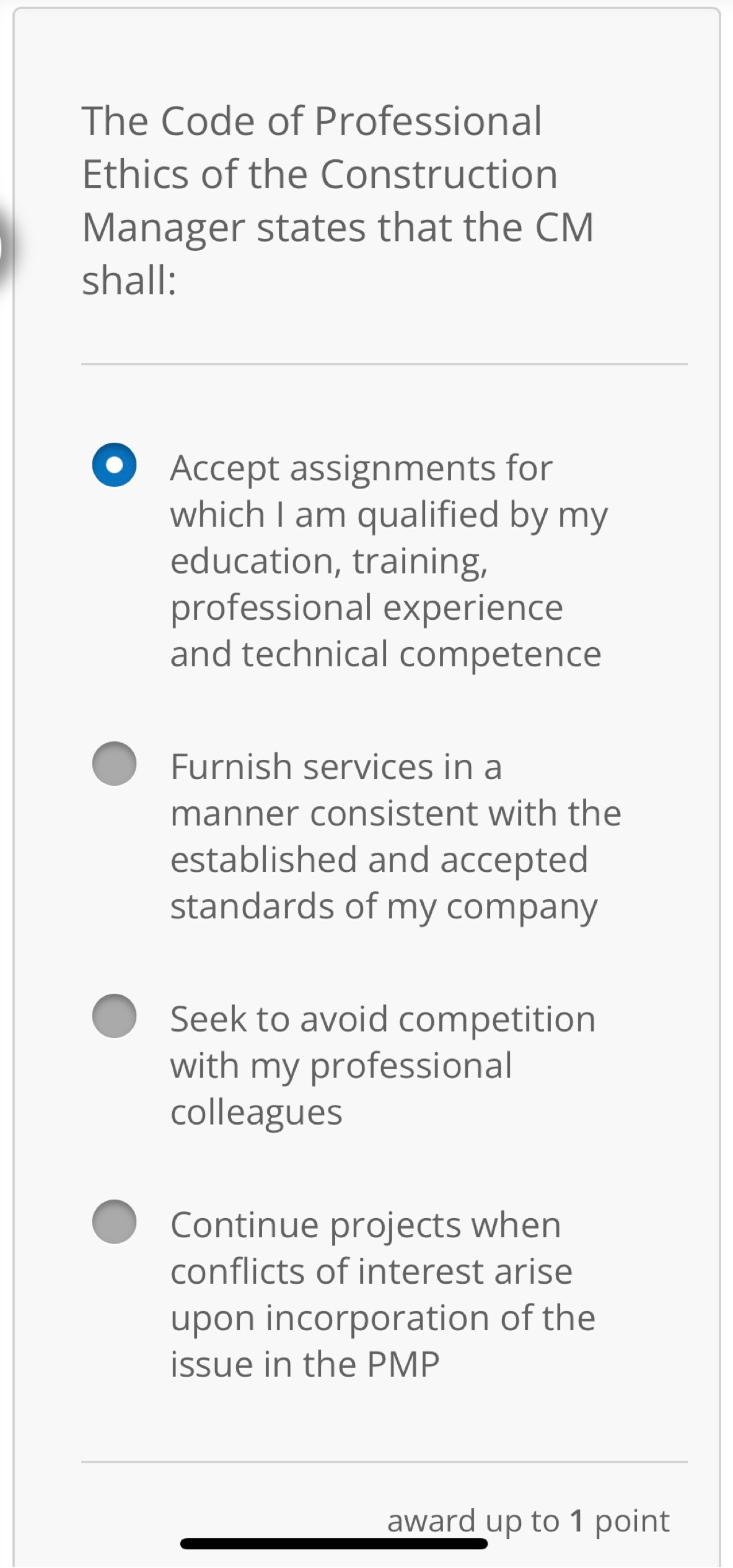 The Code of Professional Ethics of the Construction Manager states that the CM shall: