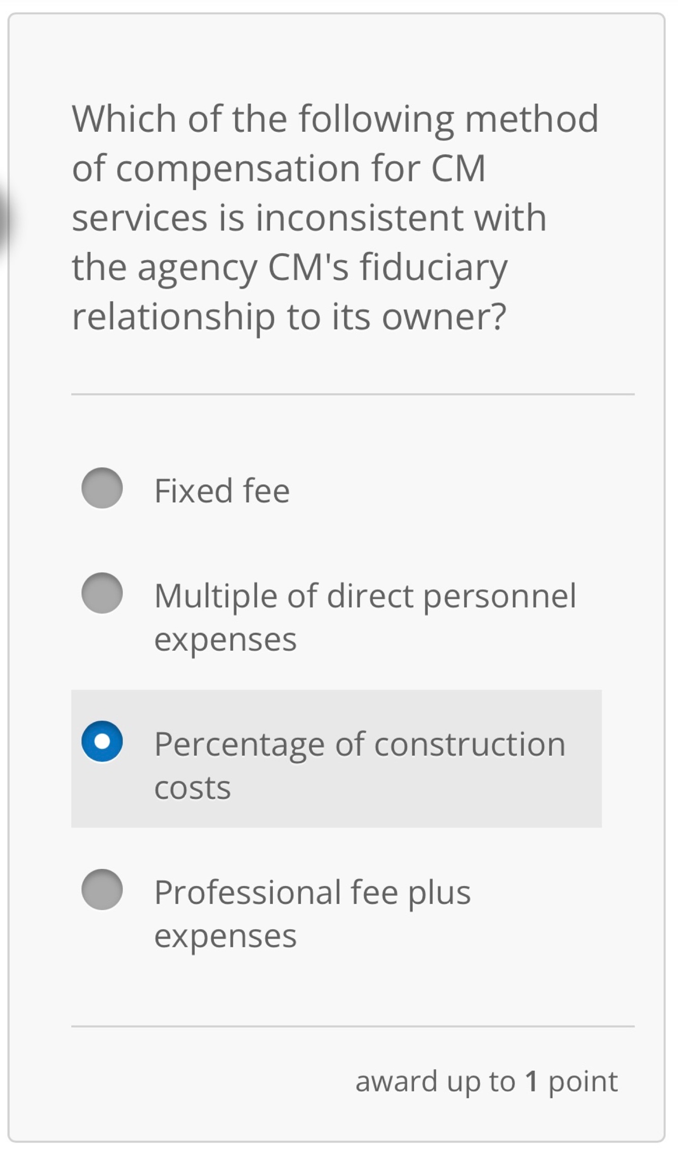 Which of the following method of compensation for CM services is INconsistent with the agency CM’s fiduciary relationship to its owner?