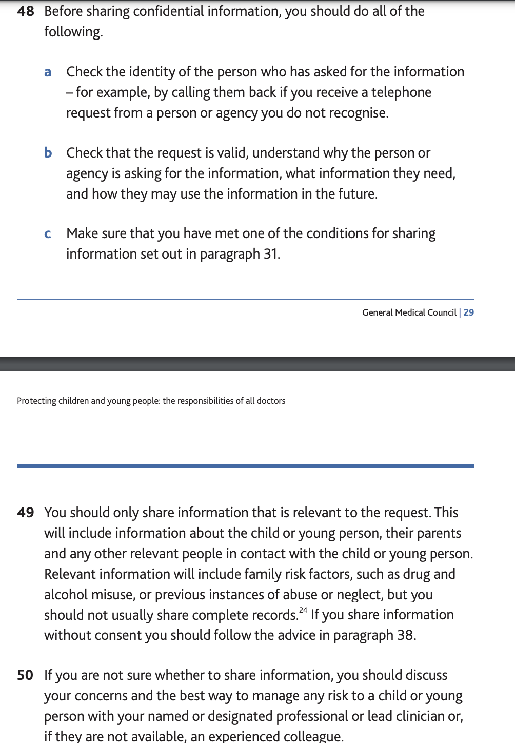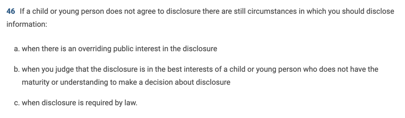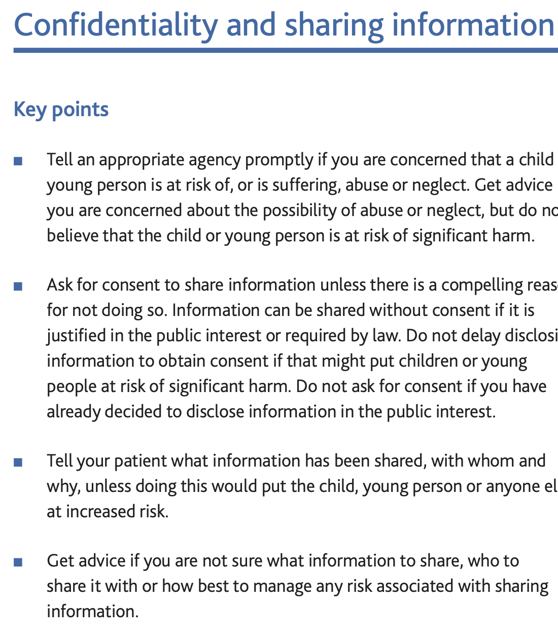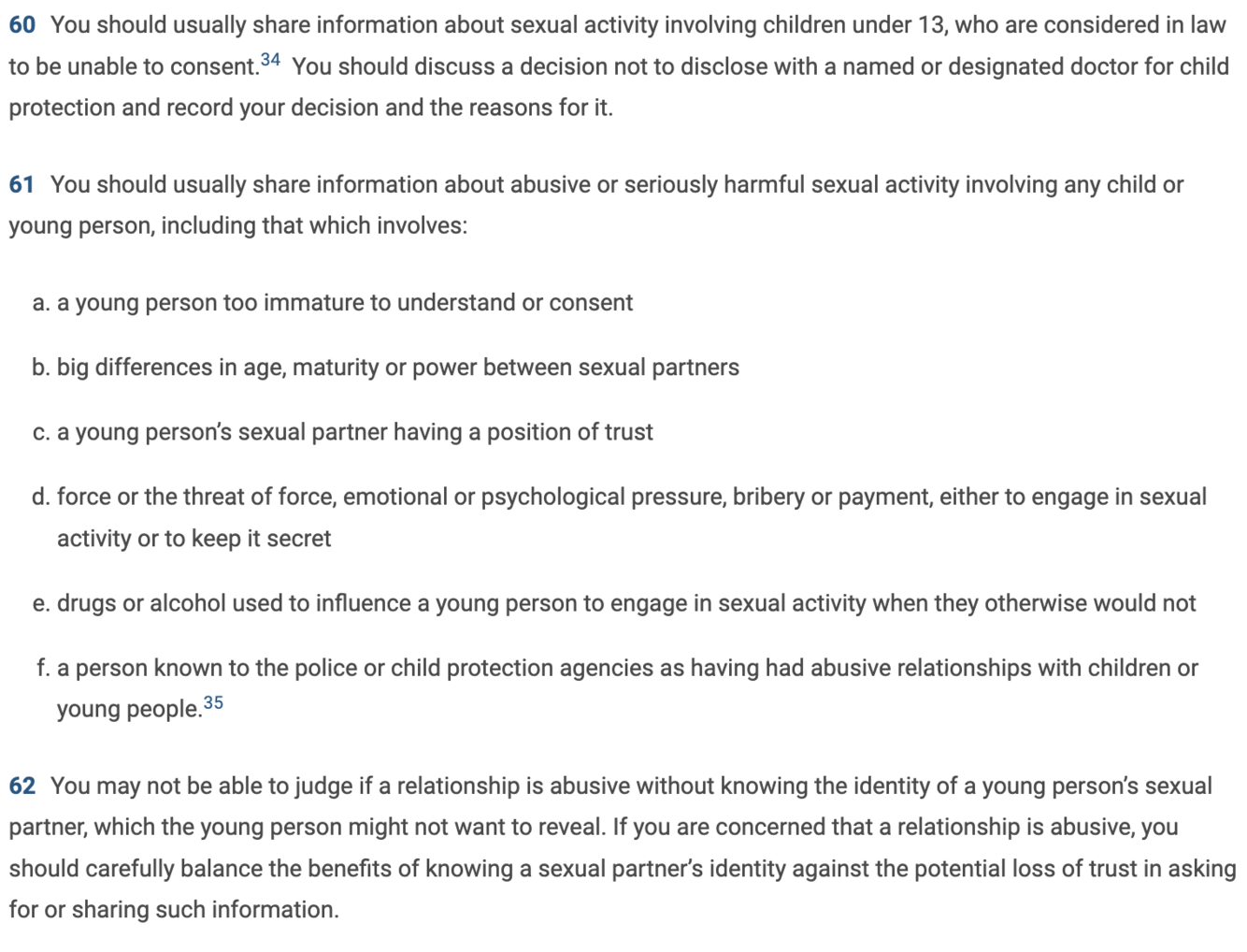 You should usually share information about sexual activity involving children under 13, who are considered in law to be unable to consent. You should discuss a decision not to disclose with a named or designated doctor for child protection and record your decision and the reasons for it.