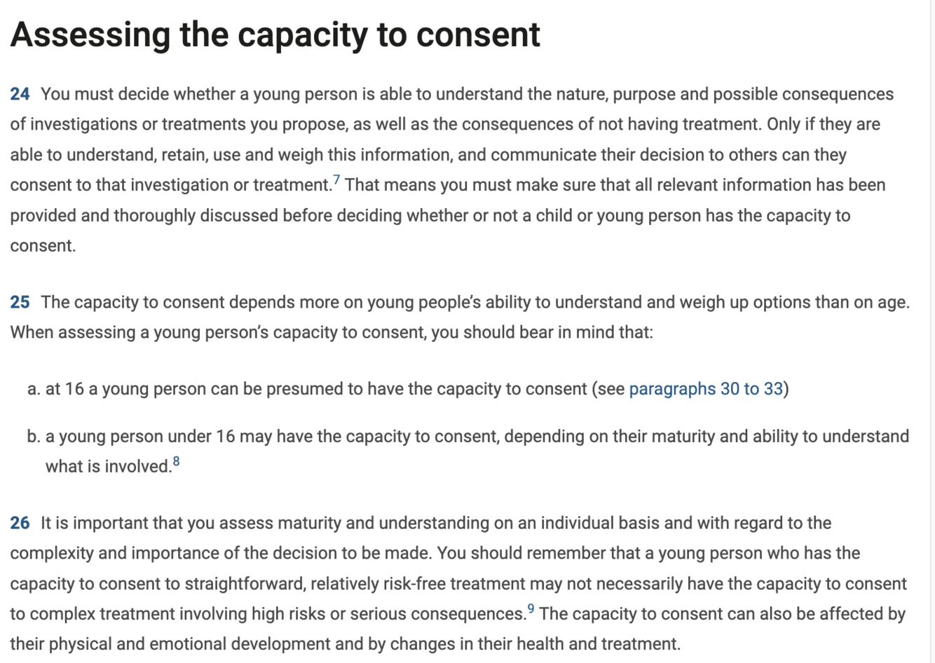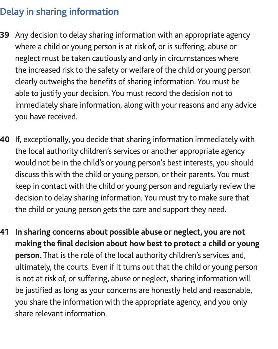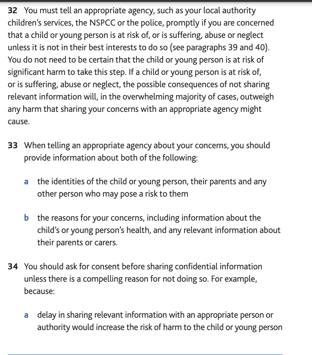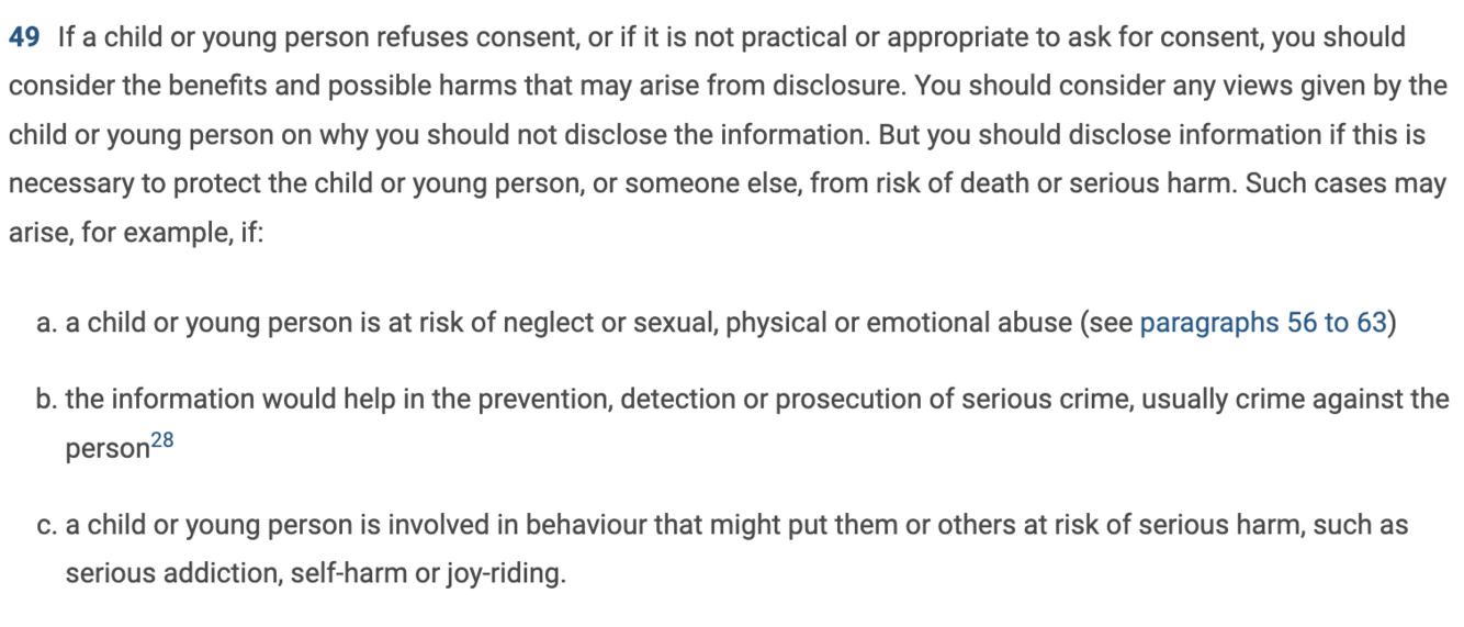 You should usually share information about sexual activity involving children under 13, who are considered in law to be unable to consent. You should discuss a decision not to disclose with a named or designated doctor for child protection and record your decision and the reasons for it.