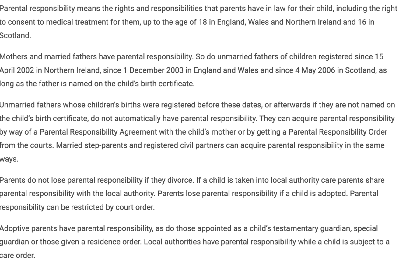 eople without parental responsibility, but who have care of a child, may do what is reasonable in all the circumstances of the case to safeguard or promote the child’s welfare. This may include step-parents, grandparents and childminders. You can rely on their consent if they are authorised by the parents. But you should make sure that their decisions are in line with those of the parents, particularly in relation to contentious or important decisions.