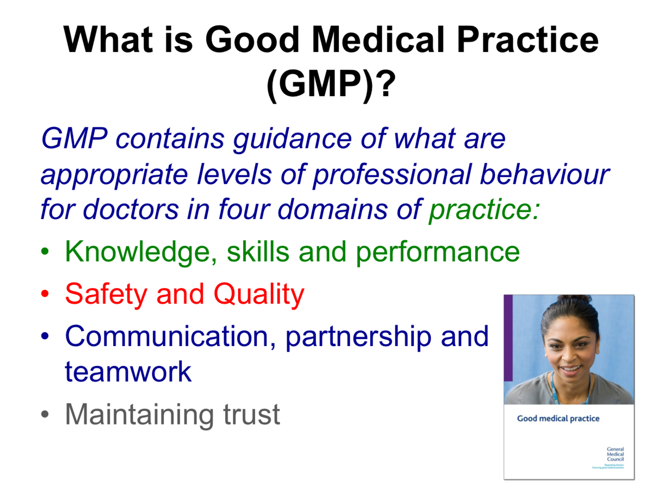 What is the Good Medical Practice (GMP), and what are the 4 domains of practice according to their guide?