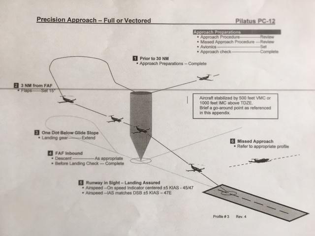 1.Prior to 30 NM - Approach Prep - complete 2. 3NM from FAF Flaps - set 15 3. One Dot Below Glide slope Landing gear - Extend 4. FAF Inbound Descent - as appropriate Before Landing Check - complete 5.Runway in Sight - Landing assured Airspeed - IAS matches DSB +- 5 kias 6. Missed Approach Refer to appropriate profile *Aircraft stabilized by 500’ VMC 1000’ IMC above TDZE Brief go around point