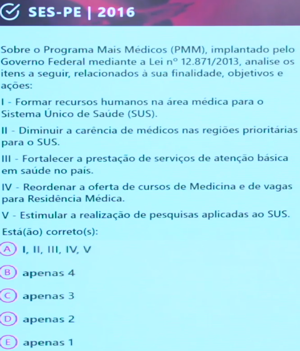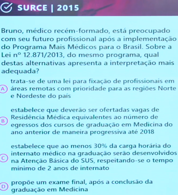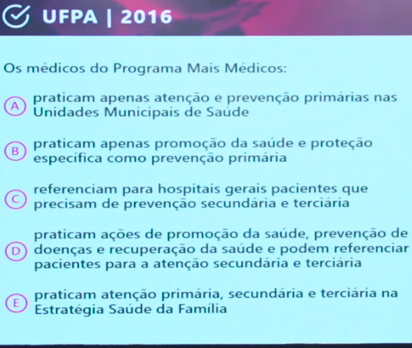 - Educação -> Aumento das vagas na graduação e na residência de Med. de Fam., alterações curriculares voltadas para a ESF (mínimo de 30% do internato na atenção básica e em serviços de urgência e emergência do SUS), avaliação no 2º, 4º e 6º anos do curso, cadastro de todos os médicos especialistas para controle de quantidade, obrigatoriedade de algumas especialidades terem que passar por med. de fam. antes.