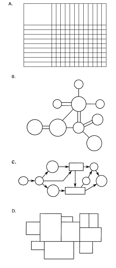 Option C is a flow diagram, as indicated by the arrows. This would be used as a scheduling chart or to show a flow of materials or some other kind of process from one point to another. Option D shows a block diagram, which represents the first results of spatial organization based on an adja cency diagram. It is not the correct answer because the question asks which diagram would be best just prior to the start of space planning.