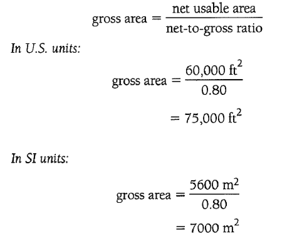 The net-to-gross ratio is found by dividing the net usable area by the gross area, which includes circulation areas, mechanical rooms, and similar ancillary areas. The desired net usable area is given and the net-to-gross ratio is known, so the needed gross area can be estimated by dividing the net area by the ratio expressed as a decimal.