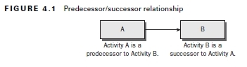 A predecessor activity is one that comes before another activity. A successor activity is one that comes after the activity in question. Figure 4.1 shows a simple predecessor/ successor relationship between Activity A and Activity B.