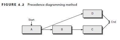 The most commonly used network diagramming method is the precedence diagramming method (PDM) . PDM uses boxes to represent the project activities and arrows to connect the boxes and show the dependencies. Figure 4.2 shows a simple PDM network diagram of tasks with fi nish - to - start dependencies.